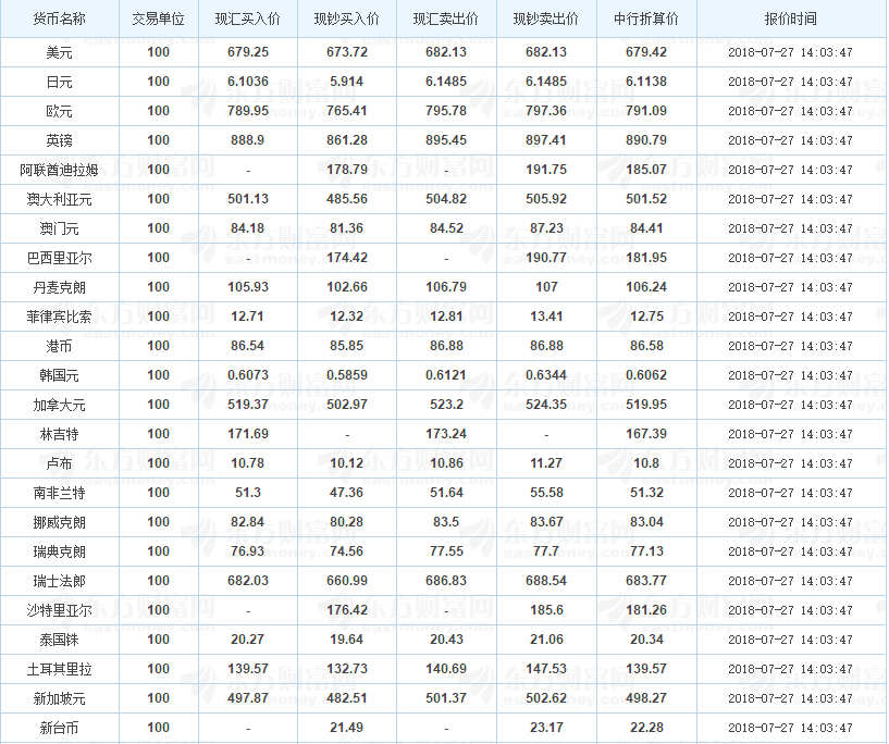 中国银行外汇牌价 2018-07-27(图片来源:东方财富网)