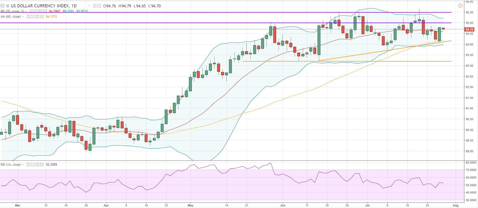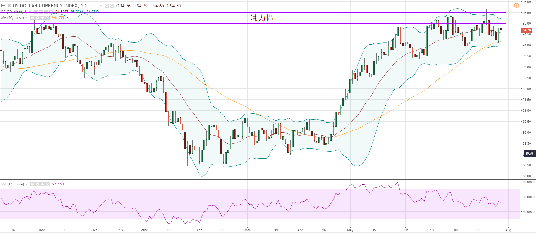 暂时来看,美元有可能再度转强,目前来看观察美元指数走势,20日均线仍守在60日线之上超於30工作天,暂时20日还没跌破60日线,反映中线上升趋势未受破坏,日图RSI也在70之下并没有超卖现象。估计欧元短期会偏弱势,美元指数再上试95-95.50阻力水平的机会远高於转势下行,尤其是欧央行的鸽派立场,加上美联储9月份升息机会很高,欧美息差进一步增加及欧美货币政策的南辕北辙将可能再成市场焦点,届时欧元有可能再度下行。