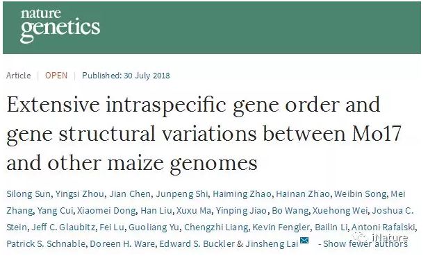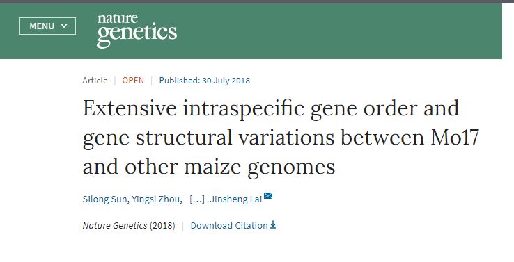 玉米是一种重要的作物,具有高水平的基因组多样性和杂种优势。 先前发布了典型雌性系B73的基因组序列。2018年7月30日,中国农业大学赖锦盛研究组在Nature Genetics在线发表题为“Extensive intraspecific gene order and gene structural variations between Mo17 and other maize genomes”的研究论文,该论文告了相应的雄性代表系Mo17的从头基因组装配。该研究提供了一个重要的玉米种质的高质量参考基因组序列,鉴定的种内基因顺序和基因结构变异应该对杂种优势和基因组进化有影响。