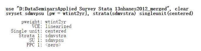在我们开始进行分析之前,我们需要声明svyset命令。svyset命令告诉Stata在调查中包含的设计元素。一旦声明这个变量,在进行数据分析时,所有的命令都要加svy:这个前缀。在2011-2012NHANES数据中,包含抽样权重(wtint2yr),PSU变量(sdmvpsu),和层变量(sdmvstra),我们可以用这些变量进行设置。