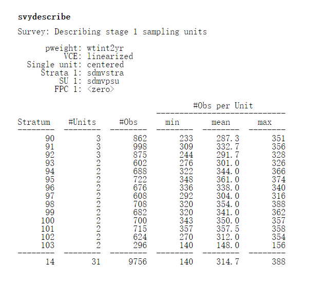 结果显示,调查数据有14个层,每个有2-3个PSU,总共有31个PSU。在每个层和每个PSU中,有各种数量的观测,最少的有140条观测,最多的有388条观测,平均每个PSU有315条观测。