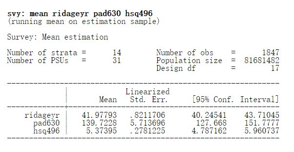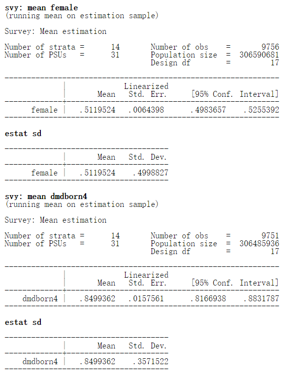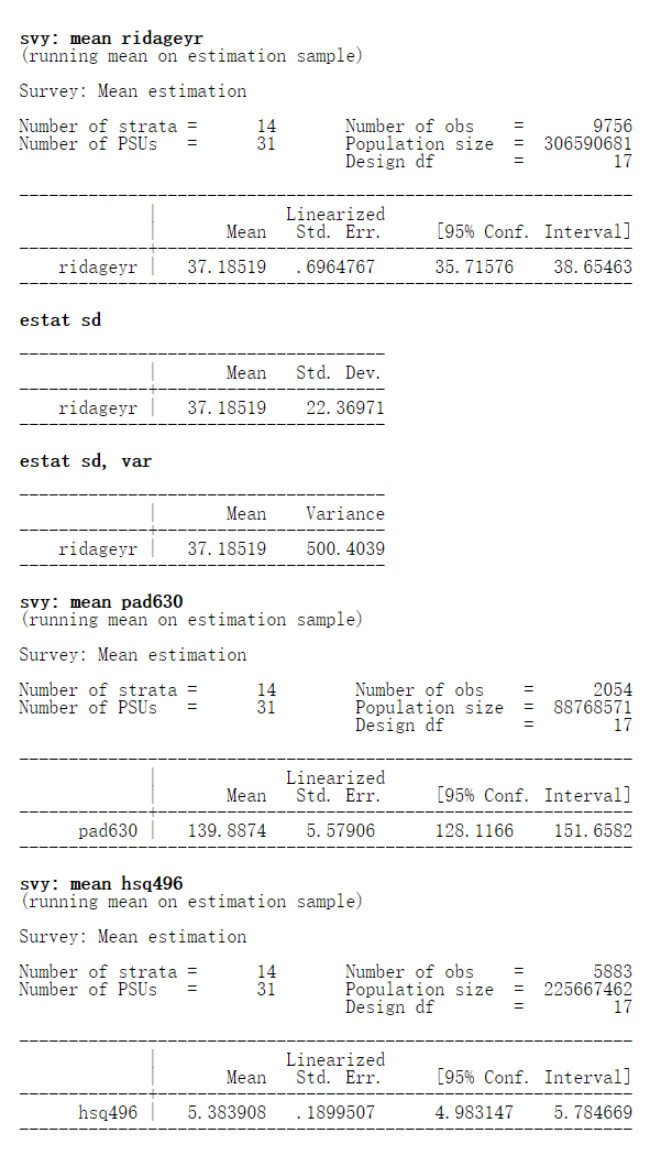 我们可以用svy:mean命令得到连续变量的平均值,并且在进行平均值操作后,我们可以用estat sd命令得到标准差和变量的方差。