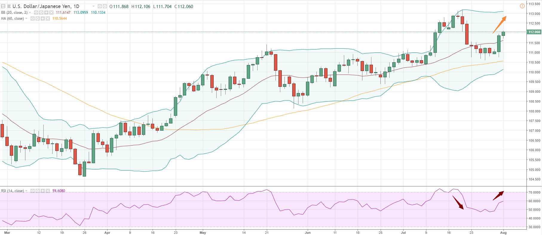 技术上,美日(USDJPY)已逐步回升,20日线超於60日线40交易天并汇价突破20天线继续保持向上,中期无疑美日仍在上升趋势,昨天新闻之後美日反而突破了上周高点111.60,证明短期力量开始增强,上升目标可留意113.20-113.50。反之,如果美日未来再度下行跌破110.50,则短期上升趋势将会改变,走势变为中性。