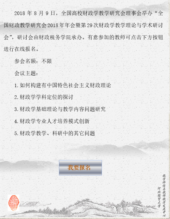 【预告】全国财政教学研究会2018年年会暨第29次财政学教学理论与学术研讨会 - 教师发展 - 河北经贸大学教学评估与教师教学发展中心