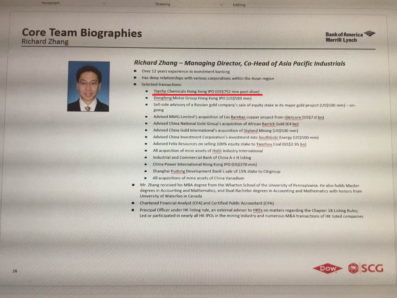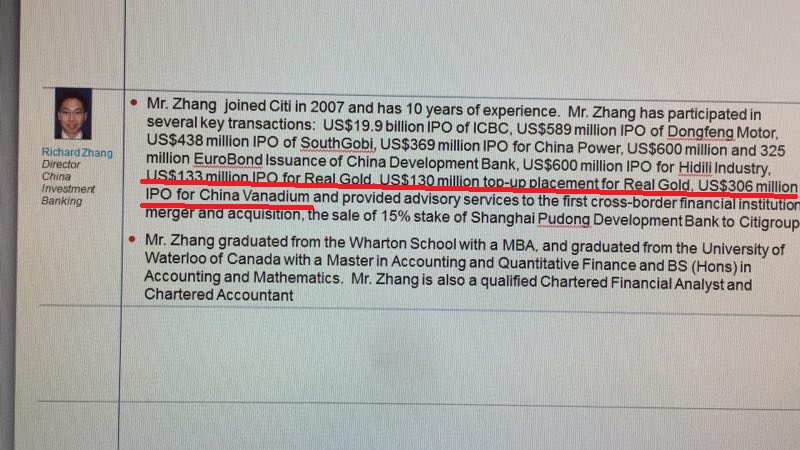 另外,瑞金矿业、中国铁钛、中国金石矿业、中国多金属都是通过联交所上市规则18章下的相关规定登陆香港交易所。在18章相关条款下,矿业公司可没有生产和利润,仅凭矿产评估师的根据地下矿藏评估的储量报告申请挂牌。这些公司都是由花旗银行在2009-2011年间密集保荐上市,这些项目负责人为花旗银行董事总经理Richard Zhang张远声。根据证监会记录显示,Richard Zhang 2007年至2012年在花旗银行工作,其于2012年7月跳槽至美银美林,并在美银美林完成了堪称香港IPO历史上最大丑闻的天合化工项目。据悉,张远声目前在车货匹配公司货车帮担任执行总裁和CFO。