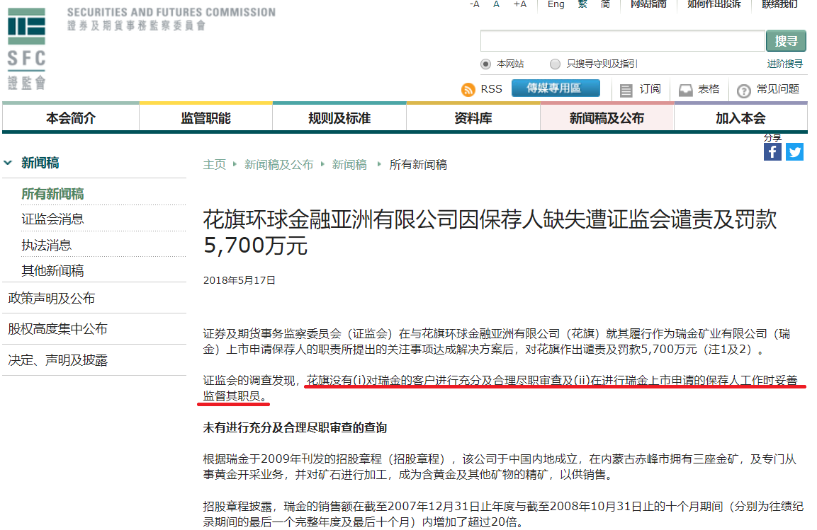 2009年2月通过上市规则18章上市的瑞金矿业,融资7个多亿港币。该公司专门从事黄金开采业务。主要收入来源是内蒙古赤峰市的三座金矿。但上市不久就有媒体曝出,占企业经营收入60%的核心资产没有生产经营迹象,甚至不具备生产经营条件。有媒体曾去赤峰实地考察发现,瑞金矿业下属的这3家金矿自始至终就未生产过,且公司上市前后的财务数据均系伪造。另外,有消息人士向媒体举报,公司实际控制人吴瑞林控股多家上市公司,其背后涉及一个完整的造假链条,“他们的目的就是造假圈钱”。瑞金矿业于2016年6月28日被香港证监会强制停止交易。2017年,IPO时隔8年后,香港证监会入禀高院控告瑞金矿业其主要股东吴瑞林、前执董崔杰、及其上市保荐人花旗银行犯市场失当行为,要求他们还原与小股东之交易或赔偿损失。