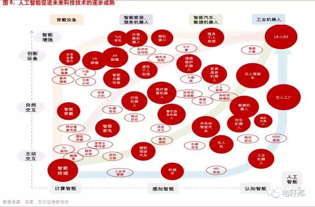 在技术层,AI 将带来计算机视觉、语音识别、手势识别等交互式技术的成熟。交互技术作为创新设备的主要约束因素,一旦被突破,将带来应用层包括智能机器人、智能无人机、智能硬件的大规模兴起。电子产业将迎来以 AI 为主导的智能硬件新时代。