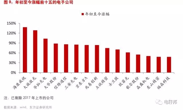 涨幅排名领先的公司包括海康威视(138%)、大族激光(129%)、华灿光电(103%)、大华股份(88%)、信维通信(86%)、三安光电(85%)等一批优秀的行业内公司。