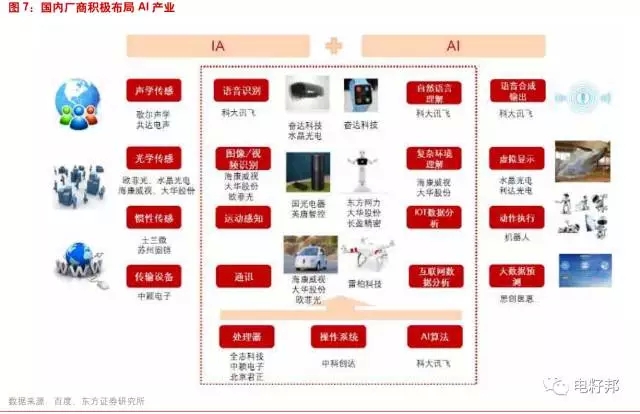 国内厂商已深入 AI 领域,在语音识别、虚拟现实、动作执行、处理器、惯性传感器、通信等环节均广泛布局,其中包括摄像头供应商欧菲光、国内安防龙头海康威视和大华股份、芯片供应商富瀚微和全志科技、芯片封测企业通富微电和长电科技等一批优质 A 股上市企业。率先布局的公司将优先享受行业发展带来的红利。
