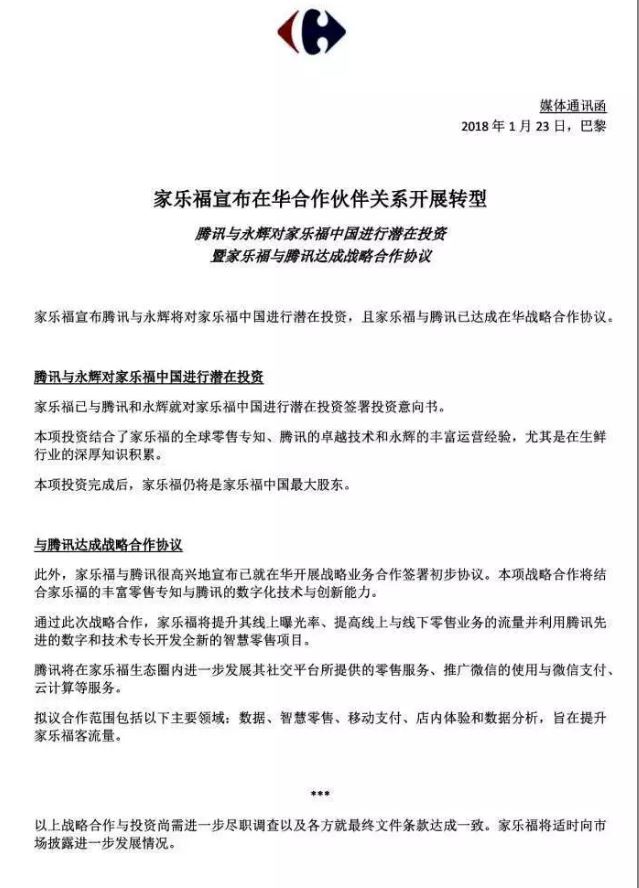 今年1月23日,家乐福宣布腾讯与永辉将对家乐福中国进行潜在投资,且家乐福与腾讯已达成在华战略合作协议。