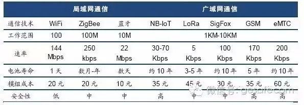 无线模组是物联网接入网络和定位的关键设备。无线模组可以分为通信模组和定位模组两大类。常见的局域网技术有WiFi、蓝牙、ZigBee等,常见的广域网技术主要有工作于授权频段的2/3/4G、NB-IoT和非授权频段的LoRa、SigFox、等技术,不同的通信对应、不同的通信模组。NB-IoT、LoRa、SigFox属于低功耗广域网(LPWA)技术,具有覆盖广、成本低功耗小等特点,是专门针对物联网的应用场景开发的。