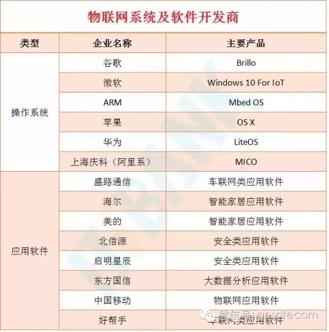 目前,发布物联网操作系统的主要是一些IT巨头,如谷歌、微软、苹果、华为、阿里等。由于物联网目前仍处阶段,应用软件开发还处于起步阶段,主要集中在车联网、智能家居、终端安全等通用性较强的领域,如盛路通信、海尔、启明星辰等。