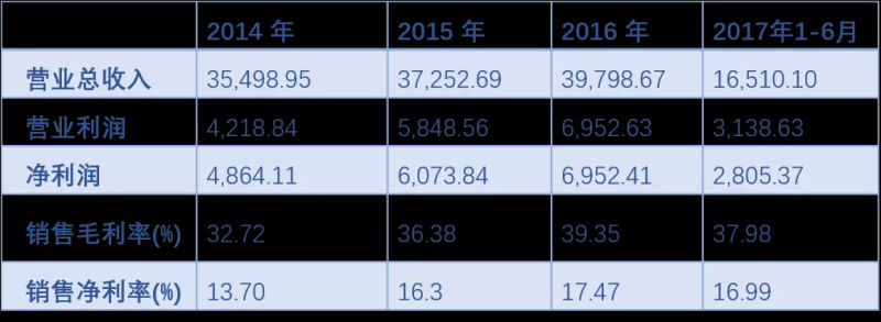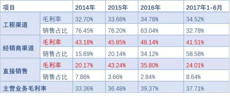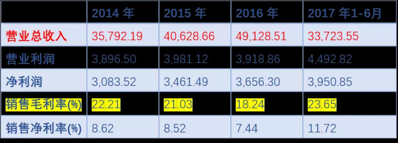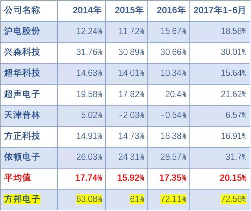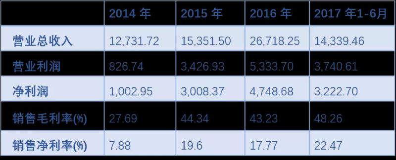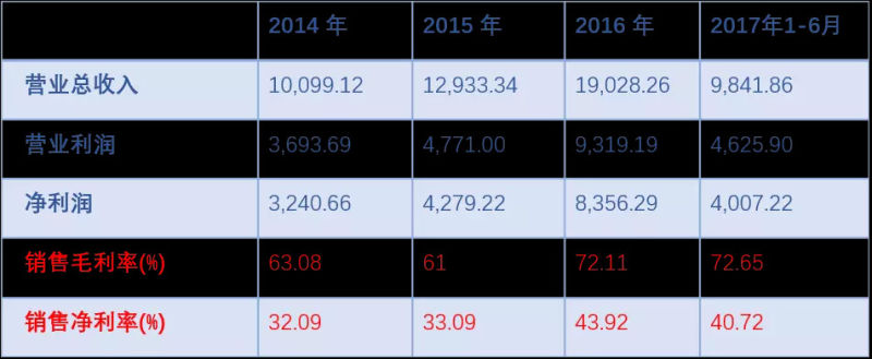 2014年至2017年6月,公司主营业务毛利率分别为63.08%、61.00%、72.11%和72.56%,几乎4倍于行业平均水平。