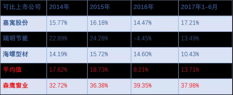 表12:森鹰窗业与同行业上市公司毛利率比较