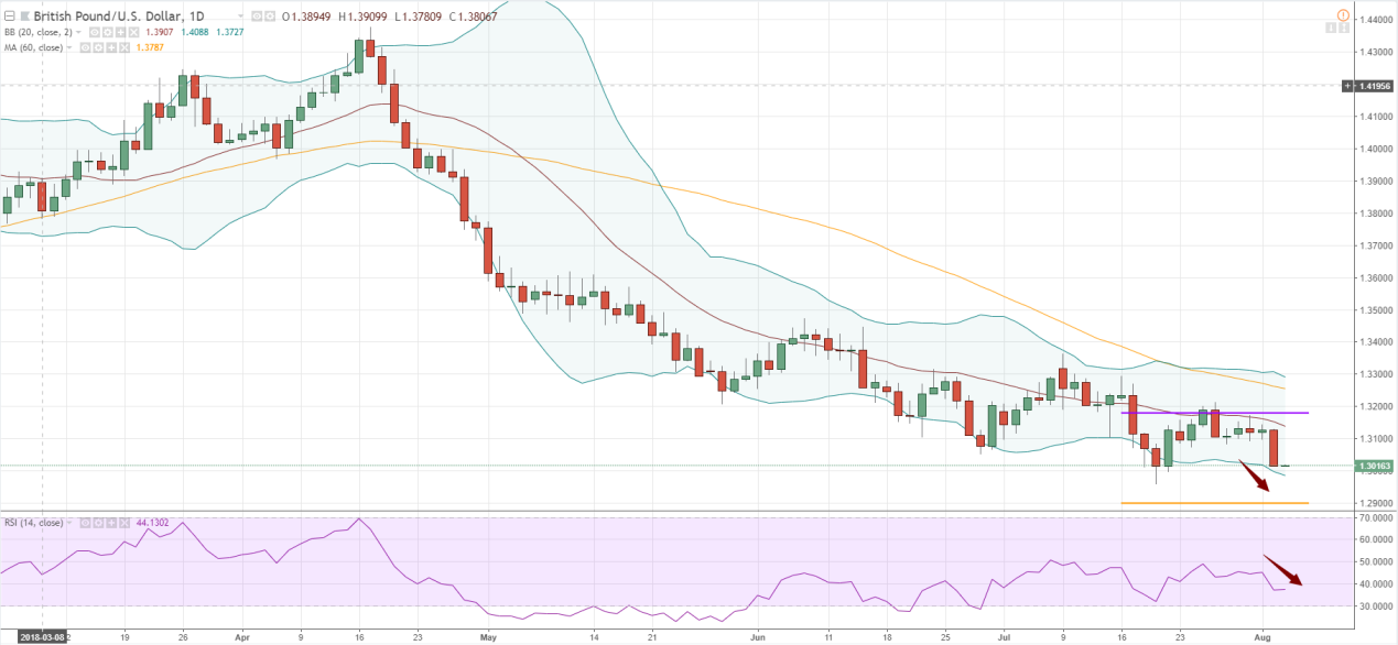 消息曾令英镑升至1.3125,但央行行长卡尼的鸽派言论之后,马上由升转跌,今天已跌至1.3015水平,日图RSI也在配合下行而且并未达超卖区30之下,英镑短期的下行概率仍高,首目标看向1.29-1.2930水平,除非英镑上破1.318,否则短期看空的态度暂不变。