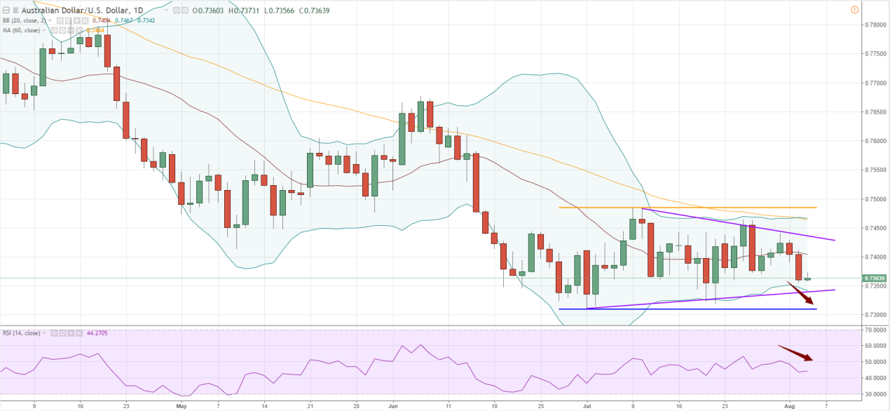 美元下行,同时近期中港股市转弱,昨天急跌,也会成为澳元(AUDUSD)再度下行的催化剂。昨天提到澳元正在走三角形的形态,似乎势将下破,日图RSI也配合下行并没超卖,昨天澳元的收盘价已重新跌破20日均线及5日低点0.7360,下行首目标可留意0.727。反之,下周如澳元上破0.7441,则否定短期下行的看法。