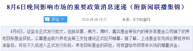 新闻联播放出消息,说多家基金公司旗下的首批养老目标基金获批。很多人解读为利好。其实,资本市场的问题必须要用逆向思维,用直线思维是致命的。然后用显微镜小心谨慎的找瑕疵,这样才能规避风险。我个人认为,这只是证监会呵护市场的态度而已。因为这些基金还是需要广大投资人去购买,目前的熊市,最终能有多少人买呢?如果最后募集了几千上万亿,那才能证明是利好。资金大才能托住大盘啊。如果一共就募集了个百十个亿,那不就是杯受车薪吗?所以这条消息在我看来是中性的,不排除被主力利用做极短线反弹套人的可能。就这么个玩意骗我进场,没门。