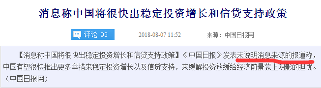 刚看到一条消息,11点多发布的,消息称中国将很快出稳定投资增长和信贷支持政策。全文讲:《中国日报》发表未说明消息来源的报道称,中国有望很快推出更多举措来稳定投资增长以及信贷支持,来缓解投资放缓给经济前景蒙上阴影的担忧。请注意,这里是未说明消息来源。什么意思呢?我解读为:如果消息不准确,就没人承担责任。没人承担责任的消息,是个什么东东呢?呵呵,您懂得。这XXX也算报道?服了,彻底服了。