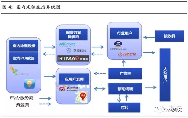 ③解决方案提供商之一:系统集成商。根据场地方需求进行室内定位解决方案提供,例如采用WiFi定位技术,则需要无线定位导航系统的整体设计、点位设计,定位引擎系统安装、调试、提供定位服务。有时候会和数据服务商相互整合,主要商业模式以2B项目制为主。(类比地图定位中的GPS卫星提供商和通信基站建设方,只是量级要小很多,以商业地产等场地方为主)。