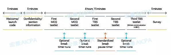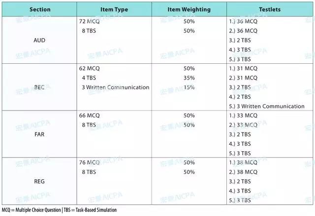 每个科目考试部分分为五个较小的部分,称为Testlet。这些Testlet题型选择题(MCQs)和基于任务的模拟(TBSs)。其中BEC科目,还包括有三个书面表达题(written communication tasks)。而MCQs和TBSs的数量取决于具体的测试科目。在AUD,FAR和REG科目测试中将有至少一个研究型问题(research-oriented TBS)。要完成它们,考生必须搜索相关的权威文献并找到适当的参考。