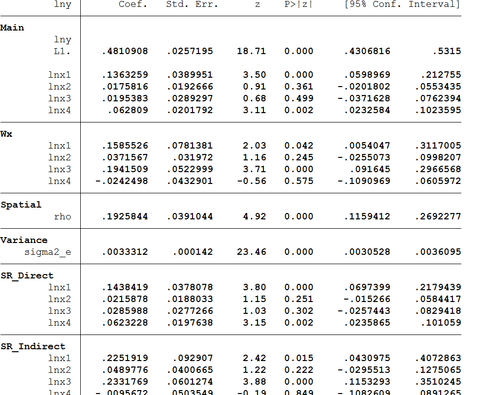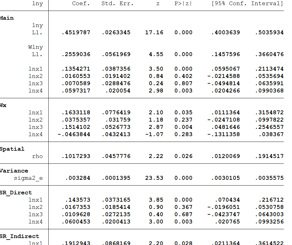 suhongwei1982 发表于 2018-8-8 15:28 图片中是动态空间面板杜宾模型的估计结果,其中的SR-direct和lr-direct, sr和lr 分别代表什么效应。