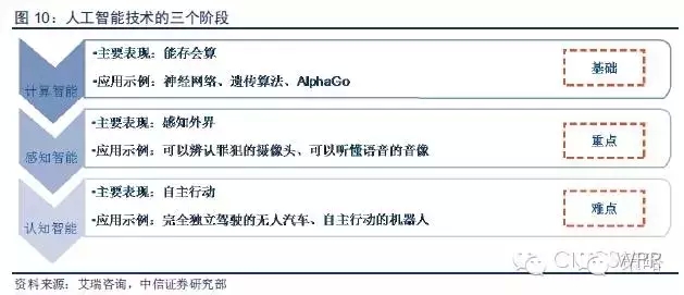 但是人工智能应用仍是广阔的等待开拓的蓝海市场。从技术层面而言,人工智能技术的发展可以分为三个阶段:计算智能、感知智能和认知智能,目前已经融合在各种传统产业中的人工智能应用主要集中在第一个阶段——计算智能,少量应用已经开始试水第二阶段的技术,即感知智能。考虑到全面的感知智能所需的应用化技术、完善的数据、高性能芯片还有待于进一步发展,感知智能技术应用普及还需要5~10年,而认知层的技术突破和数据、计算等基础资源的提升和积累是值得期待的长期发展方向。
