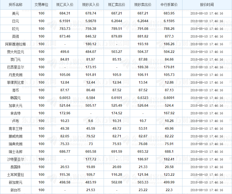 中国银行外汇牌价 2018-08-10(图片来源:东方财富网)