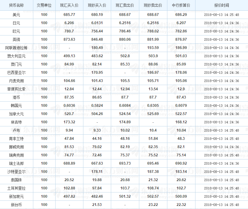 中国银行外汇牌价 2018-08-13(图片来源:东方财富网)