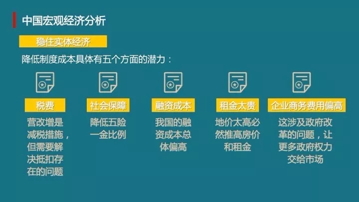 今年我们很重要的一点是关于实体经济,中央经济工作会议对实体经济有非常明确的指示,现在实体经济遇到了很大困难,这个困难一个是制度成本,一个是人力资源成本。