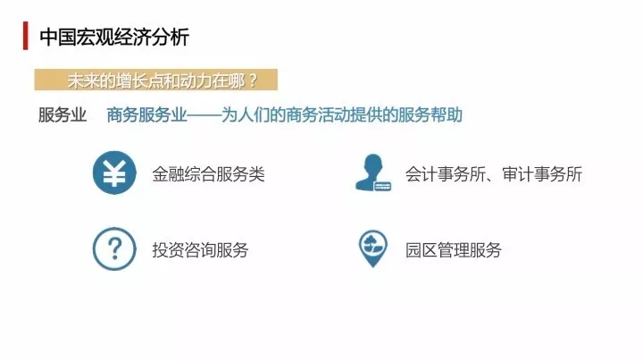 这种服务业是一种消费服务业,这些消费都是我们未来的动力。第二种服务业就是商业服务业,商业服务业也举四个例子,这些都是代表着我们国家鼓励的方向。