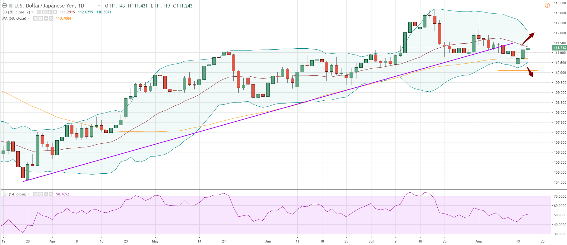 虽然上周美日跌破了从3月开展的上升趋势线,通常跌破跨季趋势线之後的10日底部再度被跌破,才能确认上升趋势逆转,这个底部现时在110.10水平,在这个水平之上暂时美日仍有再度上冲的可能性。如果短期汇价收盘价(看美东收盘)能再度往上突破111.45及20日均线,短期上升动力将增加,首目标113。