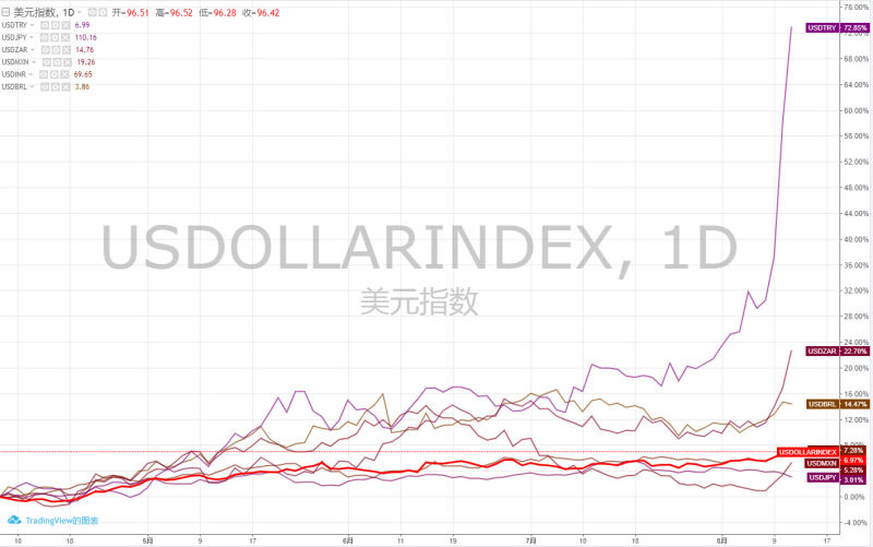 土耳其里拉对美元汇率一度跌近10%,逼近纪录低点7.2400,上周五一度重挫18%,创2001年以来最大单日跌幅。南非兰特对美元下跌超过5%,一度闪崩触及2016年6月以来的低位。墨西哥比索贬值超2.4%,上周累计贬值近2.34%。俄罗斯卢布兑美元开盘跌1.2%,为2016年4月以来新低。