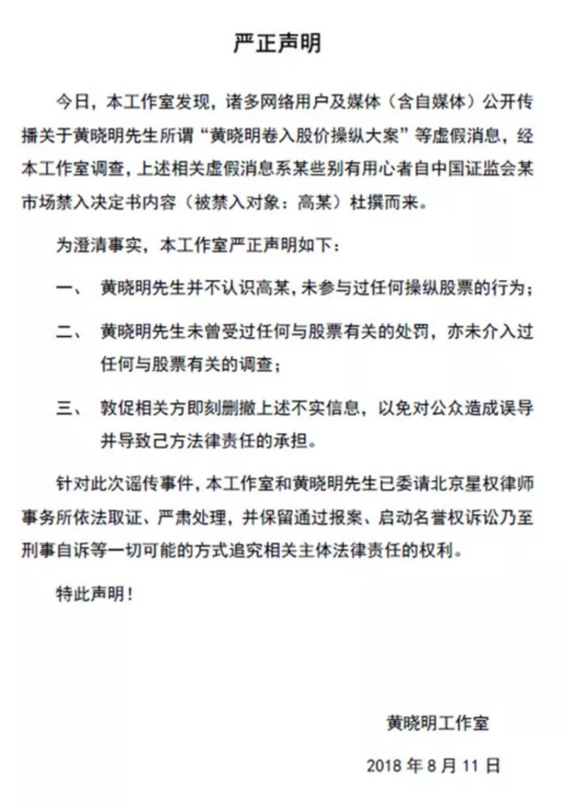 次日,黄晓明工作室赶紧否认,称黄晓明既不认识高某,也未参与任何操纵股票行为,更未受过任何股票有关的处罚或介入过任何与股票有关的调查。