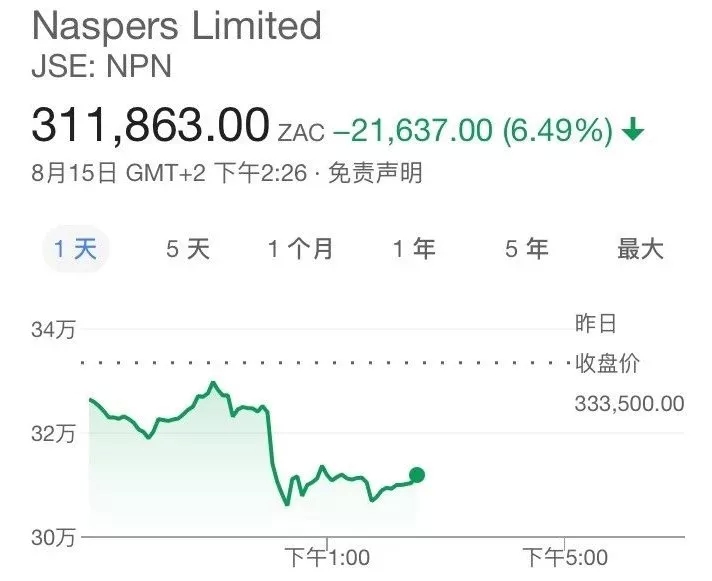 由于财报各种数据全面不及市场预期,大股东Naspers股价应声暴跌10%!目前跌幅有所收窄。