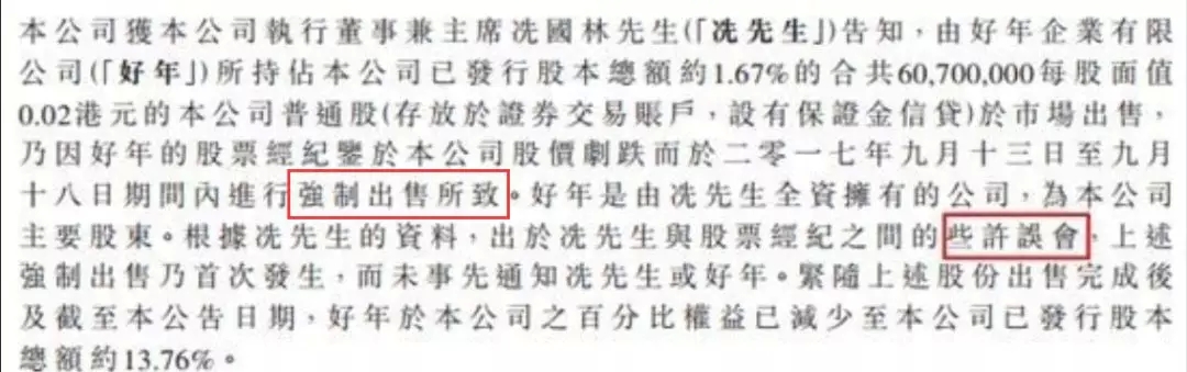 9月18日,第一信用公告声明,公司执行董事兼主席冼国林所持第一信用部分股份被股票经纪强制出售,根据冼国林提供的资料,这笔交易冼国林或好年企业事先并未得到通知,之所以发生这种情况是因为他和股票经纪之间有“些许误会”。