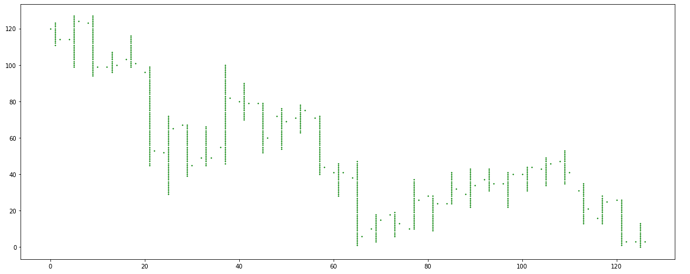 这样每个样本就构建了一张由32根K线组成,类似柱线图的“图片”,下面是一个样本画的一张图(为了便于观看,将0替换成空格,将1替换成圆点):