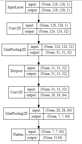 构建模型:本文所用模型共5层,先后顺序为 卷积层-池化层-卷积层-池化层-全连接层,中间还夹杂了两个Dropout和一个Flatten,用来防止过拟合和一维化数据,不过由于他们是无权重的,所以没将他们算作一层。