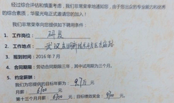 下图是知乎上某网友贴出的华星光电武汉公司2016届硕士应届生研发的待遇:年薪9.7万元+安家费2500元