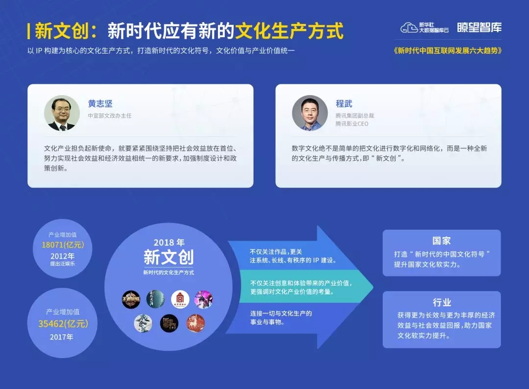 新时代中国互联网的六个趋势,既包括网络治理,也有创新技术,以及重大行业发展问题——在经过数年迅猛发展之后,产生互联网新业态最多、受益于移动互联网成效最为显著的文化产业面临历史性拐点,文化价值与产业价值并重成为重大趋势,这被企业家们总结为“新文创”这样一个极具新时代特色的名称。