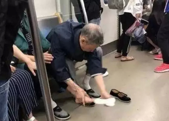 地铁上,一位老奶奶鞋子被雨淋湿,
