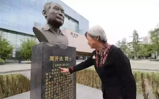 一位老人在周开达院士的雕像前驻足。