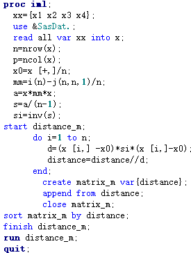 如图的数据,看作一个矩阵的四列,验证它是否是多元正态分布,请求大神看一下我的程序错在了哪里?用的是等概椭圆法,即计算马氏距离