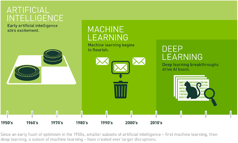 上图是人工智能与机器学习、深度学习的关系以及随时间发展的演化图。如今在工业界中,机器学习和深度学习都有着举足轻重的地位,二者解决的问题多有不同:机器学习擅长解决可结构化数据的分类预测问题,如房价预测、患病预测等;而