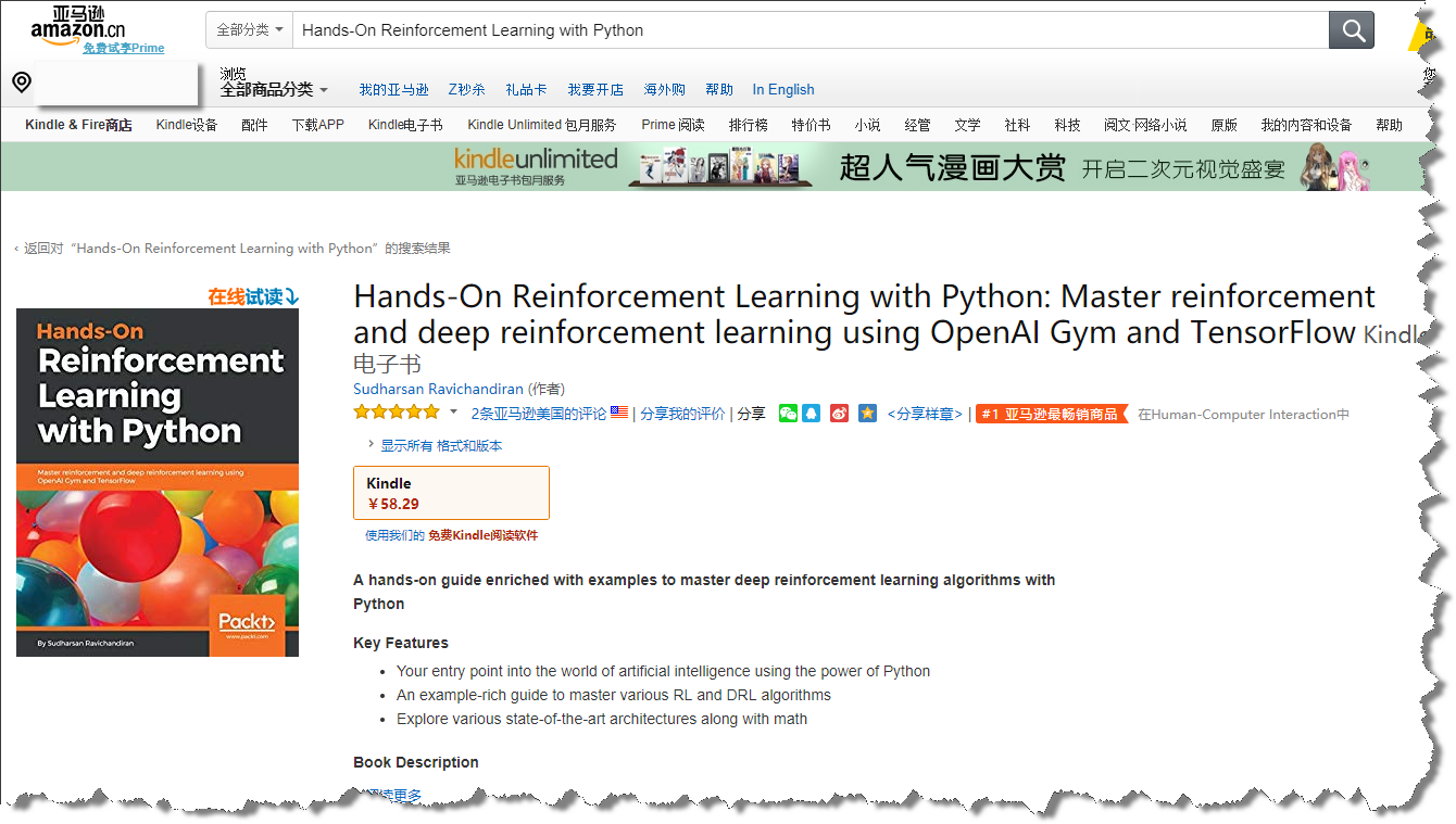 网友评论: Python强化学习实践教程强化学习目前热门!这个机器学习的分支支持者AlphaGo和Deepmind的Atari AI。其可以让程序员开发能够学习为追求最大汇报了而采取优化行为的软件代理,在一个给定的环境中视图比较不同的策略。本教程将带你学习强化学习的所有核心概念,在OpenAIGym的帮助下,将一个理论化的主题转换为实质的Python代码体验。本教程首先会指导你了解gym环境,解决CartPole-v0游戏机器人问题,然后会学习编码和使用Python解决multi-armed bandit问题。随着课程的深入,你还会学习到如何使用动态编程和基于TensorFlow的神经网络解决GridWorld,另一个OpenAI Gym挑战。最后,我们将处理21点问题,并部署使用了蒙特卡洛方法和Temporal Difference技术的没有给定模型的算法。