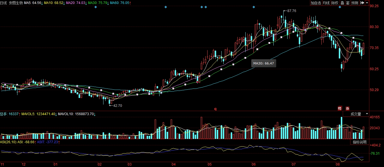安图生物所在的生物制品行业,整体涨幅为0.41%,其相关个股中利德曼,鲁抗医药,东宝生物涨幅较大,分别上涨10.0%,3.7%,0.7%;鲁抗医药,明德生物,利德曼较为活跃,换手率分别为1.6%、0.6%及0.3%;透景生命,常山药业,金花股份明显放量,量比分别为1.1,5.1,0.2;振幅较大的相关个股有透景生命,常山药业,金花股份,振幅分别为0.9%,1.0%,0.0%。