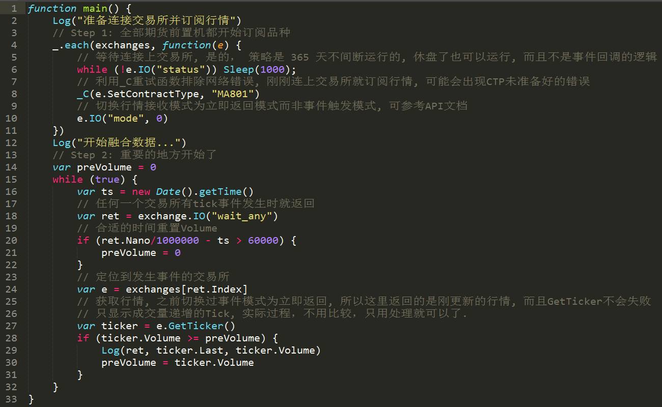 发明者量化交易平台并没有采用这种落后的回调机制,而是采用了不打断策略逻辑的main函数入口机制,让用户可以更自然的控制策略流程。用C++与Golang做为稳定的策略低层,策略上层用Javascript/Python处理逻辑问题。结合事件触发机制,同样的也能使策略在第一时间最快的速度处理行情。