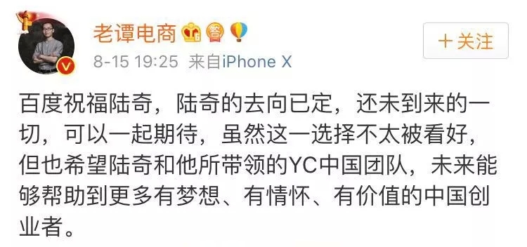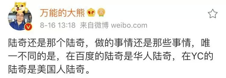 2018年8月15日,在离开百度89天之后,全球知名投资加速器Y-Combinator宣布正式入华,陆奇则宣布自己成为YC的001号员工,兼任YC中国创始人及首席执行官。