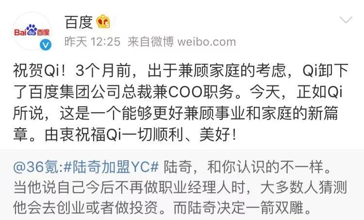 2018年7月,陆奇以家庭原因为由,卸任百度集团总裁及首席运营官职务。自此,他的去留成为了万众瞩目的谜团。