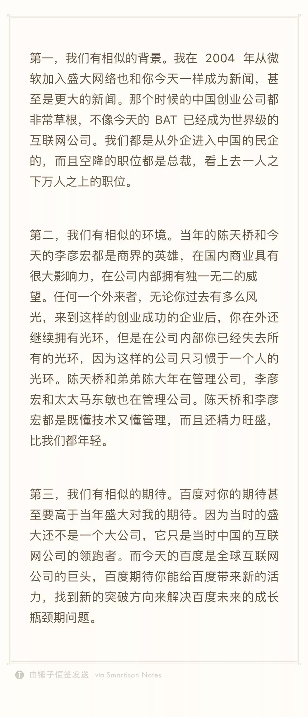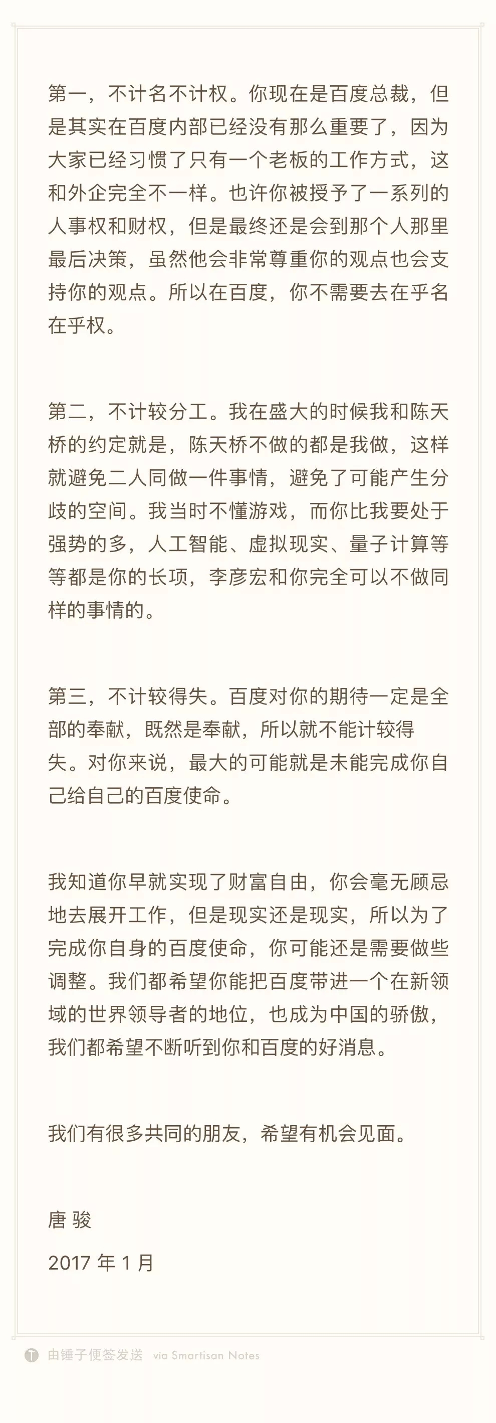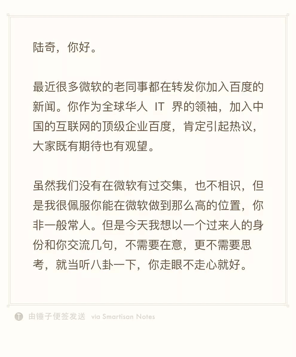 这一点,其实早在陆奇2017年1月加入百度时,从“打工皇帝”唐骏写给陆奇的一篇文章中便提到了。如今我将它献给好奇的你。