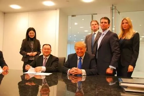 (2008年2月,恒大集团总裁夏海钧与特朗普在其三名子女见证下签约,计划共同投标广州东塔项目,后由于特朗普实际不具备出资能力,合作未能实现。)